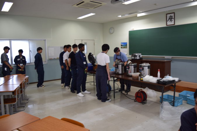 次は皆さんお楽しみの体験実習です。学校からお貸しするつなぎに着替え、実習場に集合です!