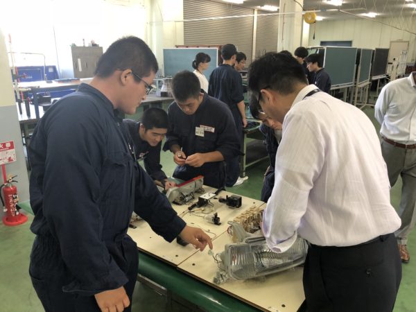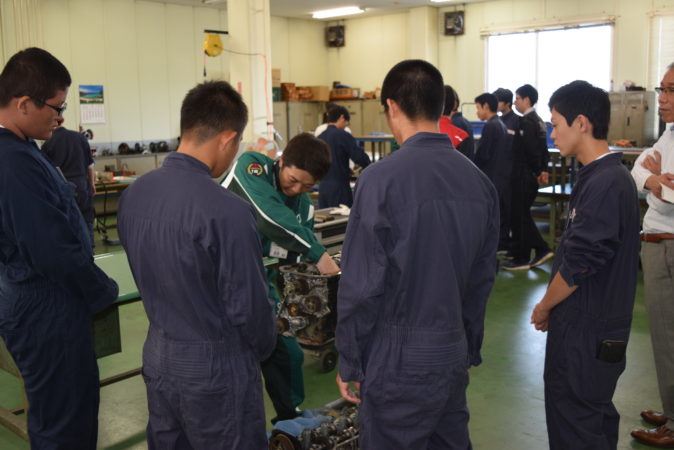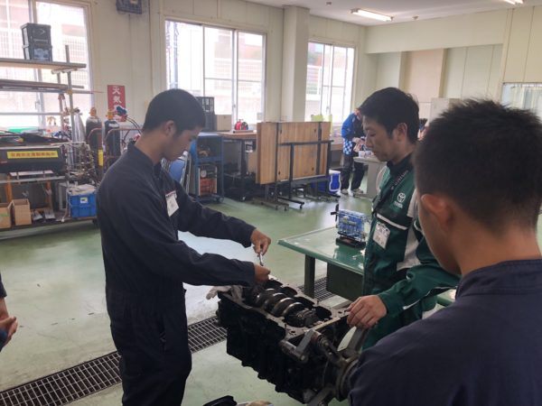 一つ目は、エンジン本体のピストン脱着です。技術部の方にご指導いただきながら皆さんにも